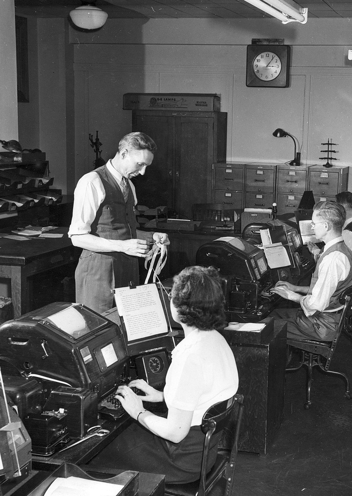 The photo shows a 1947 USDA newsroom. Credit Wikipedia Commons.